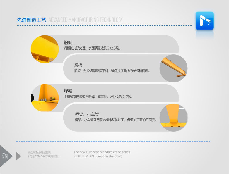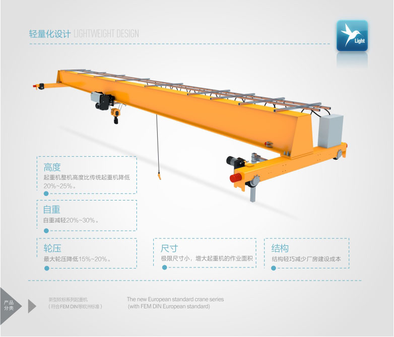 2、 該產(chǎn)品技術(shù)先進(jìn),設(shè)計(jì)按照國際標(biāo)準(zhǔn):DIN(德國)、FEM(歐洲)、ISO(國際),具有剛性強(qiáng)、自重輕、結(jié)構(gòu)設(shè)計(jì)出眾等優(yōu)點(diǎn),能有效地節(jié)約廠房空間和投資成本,行走結(jié)構(gòu)特點(diǎn)獨(dú)特。