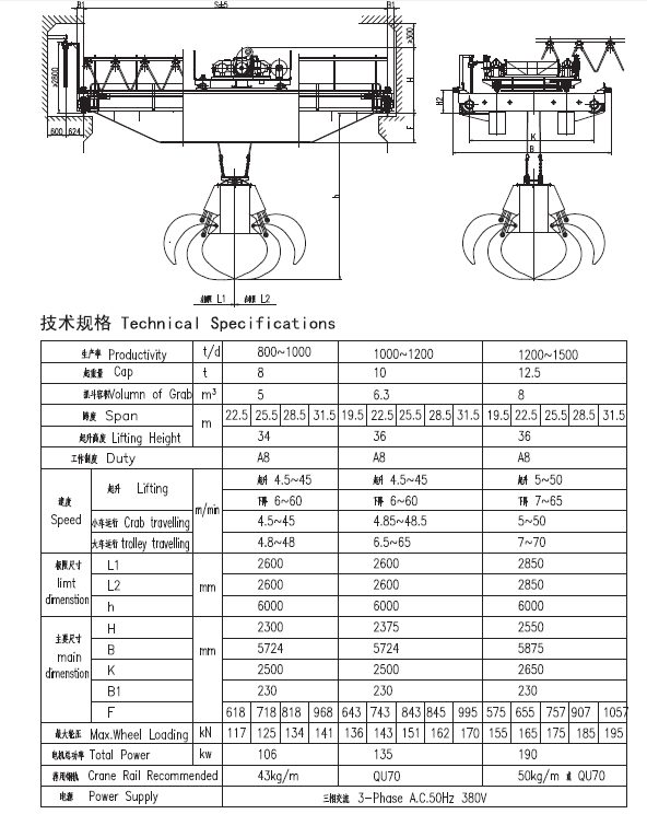 2、 我公司生產(chǎn)的垃圾抓斗起重機(jī)能執(zhí)行嚴(yán)格的提升及輸送作業(yè),確保垃圾焚燒發(fā)電廠的正常作業(yè)。