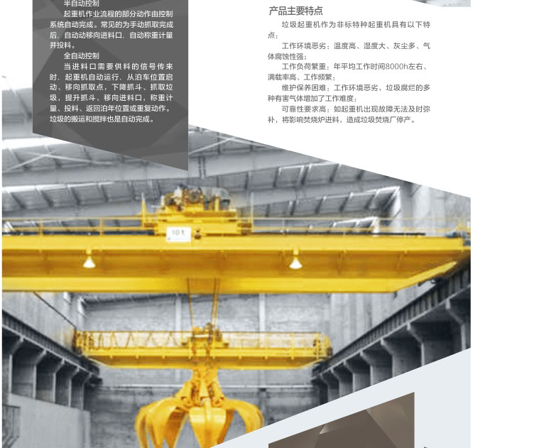 2、 我公司生產(chǎn)的垃圾抓斗起重機(jī)能執(zhí)行嚴(yán)格的提升及輸送作業(yè),確保垃圾焚燒發(fā)電廠的正常作業(yè)。